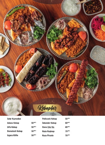Kebaplar Satır Kıymadan Patlıcanlı Kebap 55 .00 Adana Kebap 50 .00 İskender Kebap 60 .00 Urfa Kebap 50 .00 Dana Çöp Şiş 65 .00 Domatesli Kebap 50 .00 Kuzu Kuşbaşı 75 .00 Izgara Köfte 50 .00 Kuzu Pirzola 75 .00