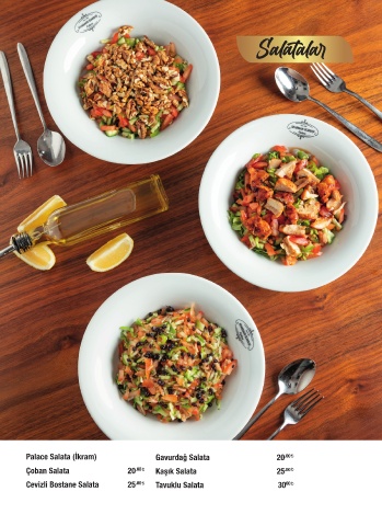 Salatalar Palace Salata (İkram) Gavurdağ Salata 20 .00 Çoban Salata 20 .00 Kaşık Salata 25 .00 Cevizli Bostane Salata 25 .00 Tavuklu Salata 30 00